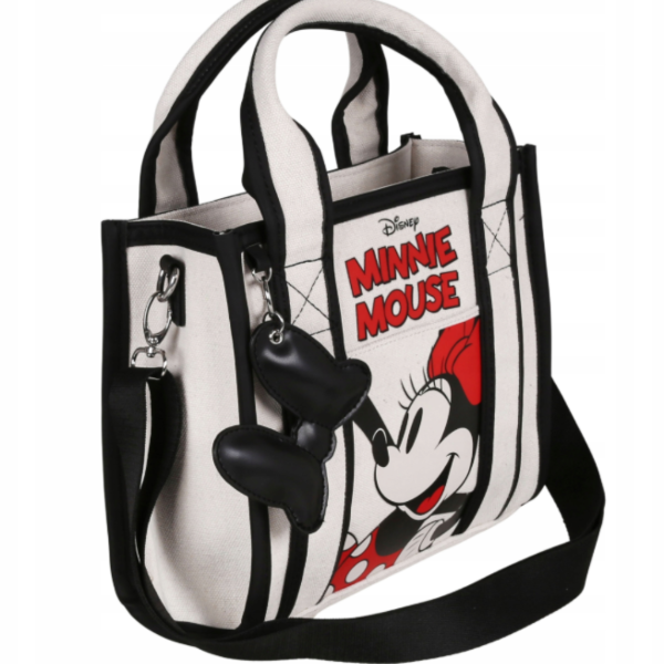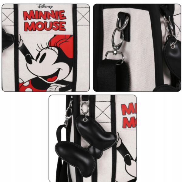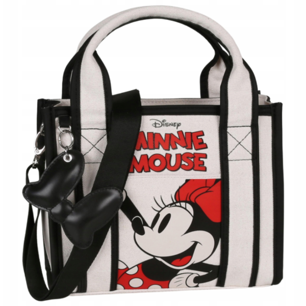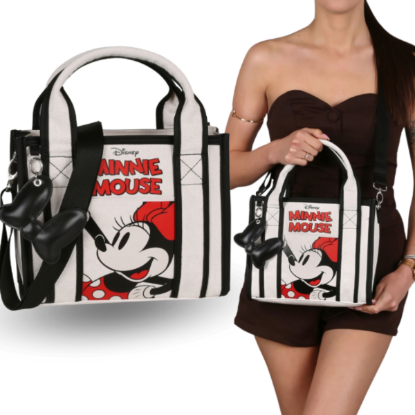 En tono beige y detalles en negro, esta cartera muestra una hermosa estampa de Minnie Mouse en el frente!