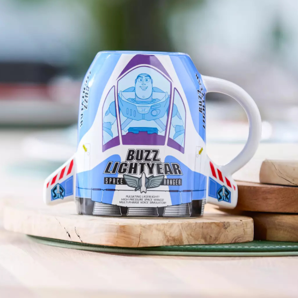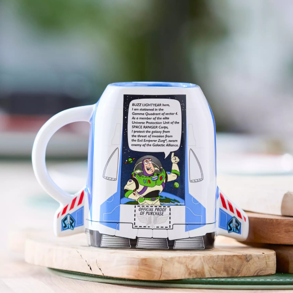 Despega cada mañana tras un sorbo de combustible líquido de la taza de cerámica de Buzz Lightyear, diseñada con la forma del icónico empaque de su figura de acción, como se ve en las películas de Toy Story