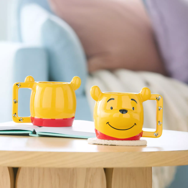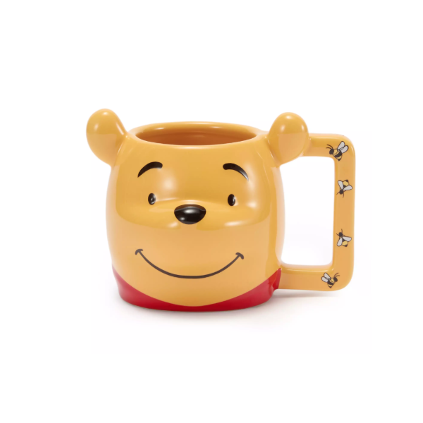 Esta taza de cerámica con forma de Winnie the Pooh está decorada con abejas estampadas en el asa.