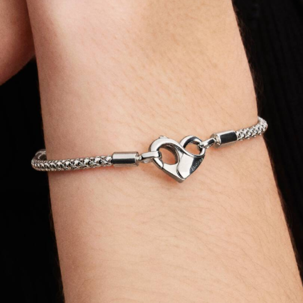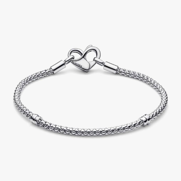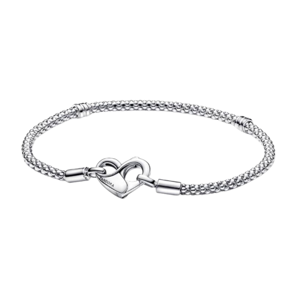 Este brazalete tiene una cadena flexible con textura y un broche con forma de corazón con detalles del infinito que se puede abrir y el símbolo del infinito en el interior.