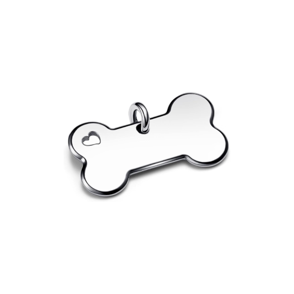 Está hecho de acero inoxidable pulido para tu familiar de cuatro patas y tiene un pequeño corazón perforado en una esquina del hueso