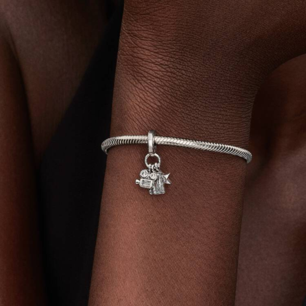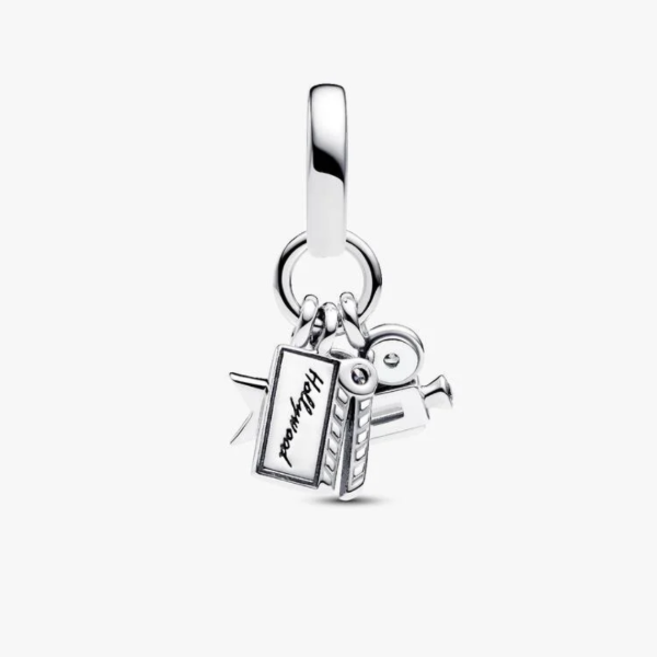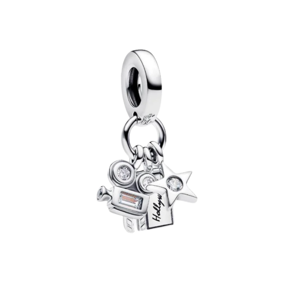 Luces, cámara, acción! Brilla con luz propia con nuestro charm colgante de inspiración hollywoodiense en plata 925, que presenta una claqueta, una cámara de cine y un brillante motivo de estrella de circonita cúbica, grabado con la palabra "Hollywood"
