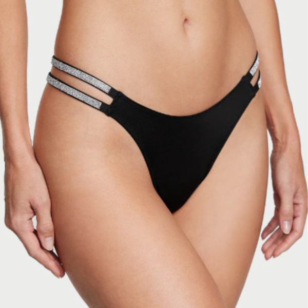 Colaess negra tiro bajo de lycra con doble tira y detalle de brillos plateados en sus tiras