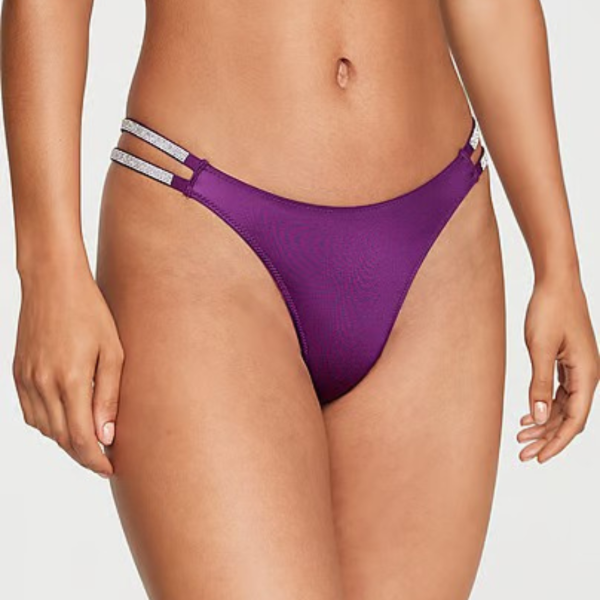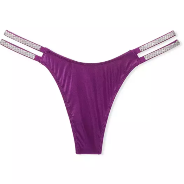 Colaess violeta tiro bajo de lycra con doble tira y detalle de brillos plateados en sus tiras
