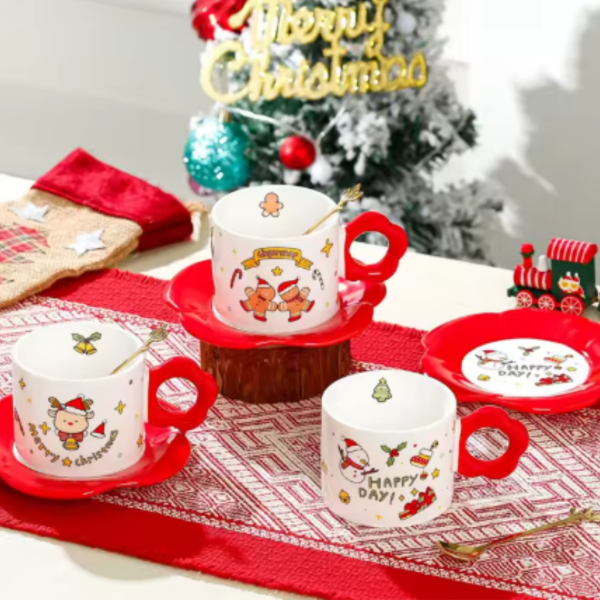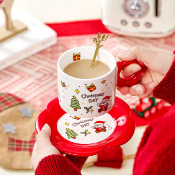 Hermoso taza de cerámica con diseño navideño y con el asa en forma de flor!