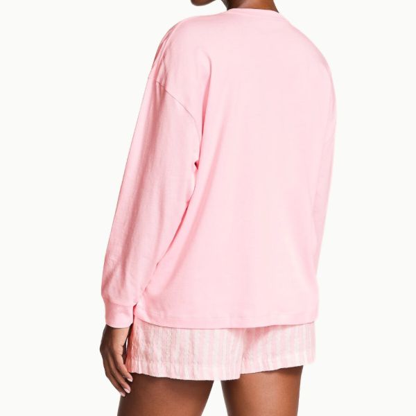 Hermoso set de pijama que incluye una remera manga larga con un aplique de glitter y un short con diseño rallado!